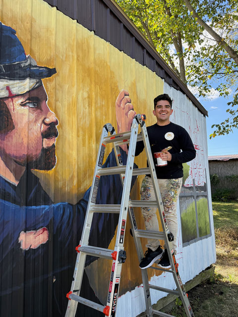 The Brandy Station Foundation hired local artist Layton Scarbrough to create a mural for a large shed next to its Graffiti House in Brandy Station. The artist completed the mural on Friday, October 10th. He did an excellent job of conceptualizing a composition, and then worked with the board of the Brandy Station Foundation as board suggestions and alternate sketches by the artist were generated and reviewed. The selected mural depicts soldiers who would have been in the house at different periods during the Civil War, one recovering from battle, and the other sketching a woman on the plaster wall of the Graffiti House. Outside a window, the mural depicts a train passing on the track behind the Graffiti House known as the Orange and Alexandria Railroad during the Civil War. Click on a photo below to view a larger image of the mural.